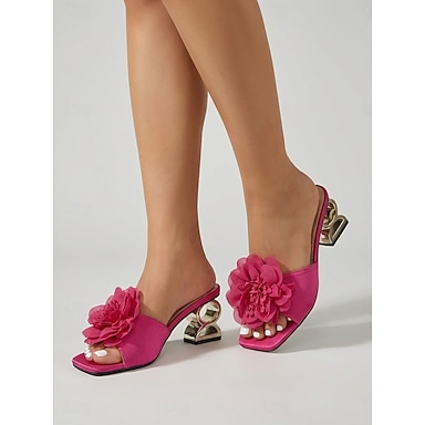 Sandálias femininas de salto alto com estampa floral rosa, modelo slip-on de bico aberto, perfeitas para jantares em resorts e férias. &eventos noturnos de verão