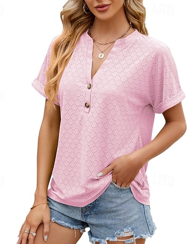 Mulheres Blusa Textura Topo de ilhó Camiseta Pointelle Camiseta Ilhó Côr Sólida Moda Clássico Casual Manga Curta Decote V Tops regulares Casual Diário Praia Preto Branco Rosa Azul Marinha Verde Escuro