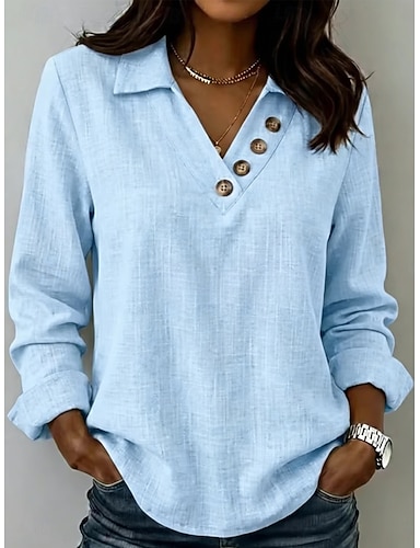 Mulheres Camisa Social Camisa de algodão e linho Blusa Linho de algodão sintético Botões Côr Sólida Tecido Vintage à moda Clássico Manga Longa Decote V Colarinho de Camisa Ombro a Ombro Tops