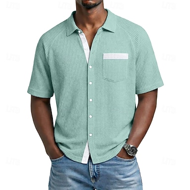 Homens Camisa Social Camisa Waffle Textura Camisa casual camisa de botão Preto Verde Claro Azul Escuro Azul Claro Manga Curta Tecido Colarinho Italiano Lapela Casual Diário Roupa Moda Moderno Casual
