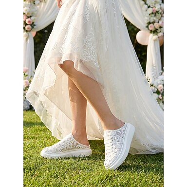 Tênis slip-on feminino branco de renda para noiva - calçado confortável com detalhes em strass para casamento no jardim.