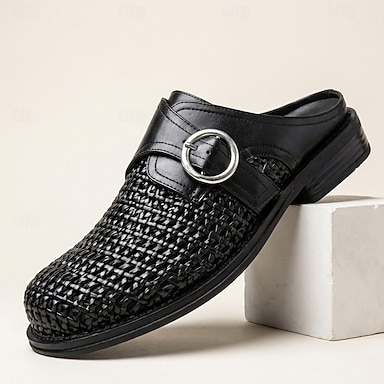 Mules masculinas pretas em couro sintético, sapatos sociais clássicos e confortáveis para o escritório, ocasiões formais e uso casual no dia a dia.