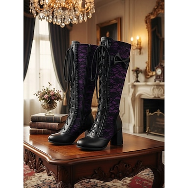 Botas femininas de cano alto com cadarço preto e roxo, salto grosso e detalhe de laço, estilo gótico vitoriano dos anos 1920, botas da moda para cosplay, Halloween &roupa de festa
