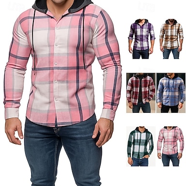 Homens Camisa Social Camisa casual camisa de botão Rosa Vinho Azul Marinha Roxo Verde Manga Longa Xadrez Com Capuz Casual Diário Com Cordão Roupa Moda Casual Confortável