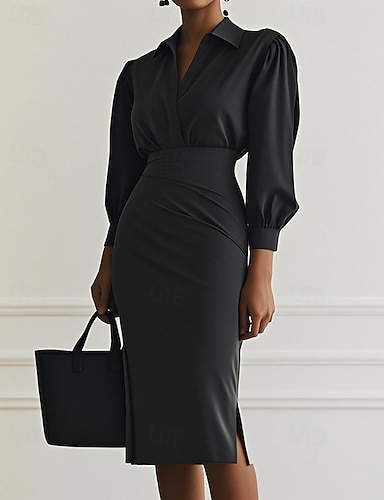 Mulheres Vestido no Joelho Vestido preto Vestido Coquetel Vestido formal Elegante Moda Festa Normal Tecido Manga Longa Decote V Preto Verão Primavera Inverno Outono
