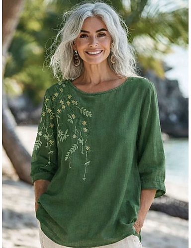 Mulheres Blusa Camisa de linho sintético Bordado Botões Floral à moda Casual Manga 3/4 Gola Redonda Tops regulares Diário Amarelo Roxo Verde Cinzento Verão Primavera Outono