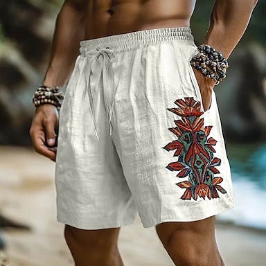 Homens Calção Shorts de linho Shorts de verão Shorts de praia Com Cordão Cintura elástica Conforto Respirável Comprimento do joelho Ao ar livre Feriado Roupa de Praia Férias Estilo Étnico Preto Azul
