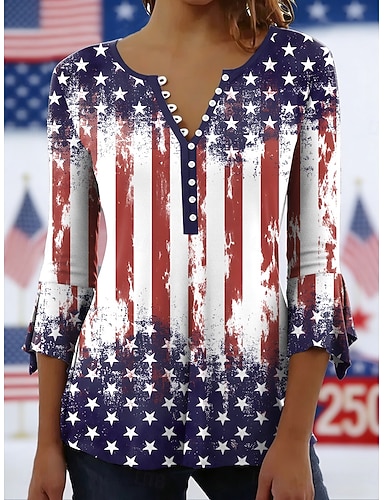 Blusa Feminina Patriótica do Dia da Independência Estampa Gráfica Bandeira Elegante Estilosa Manga 3/4 Gola Redonda Longas Tops Diários para Sair Babados Botões Azul Vermelho Verão Primavera