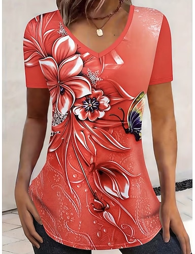 Mulheres Camiseta Imprimir Âmbar Floral Gráfico à moda Clássico Casual Manga Curta Decote V Tops regulares Diário Azul Vermelho Laranja Cinzento Verão Primavera