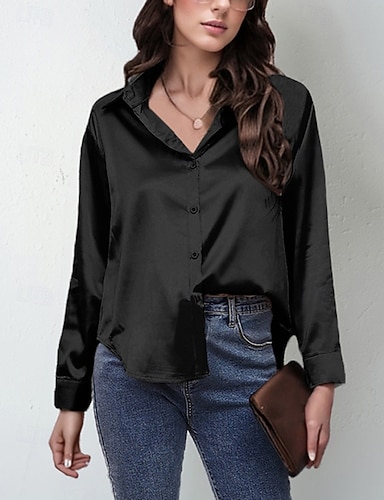 Mulheres Camisa Social Elegant Top de cetim Blusa Botões Tecido Elegante à moda Manga Longa Colarinho de Camisa Tops regulares Diário Feriado Para Noite Azul Preto Branco Amarelo Verde Claro Verão