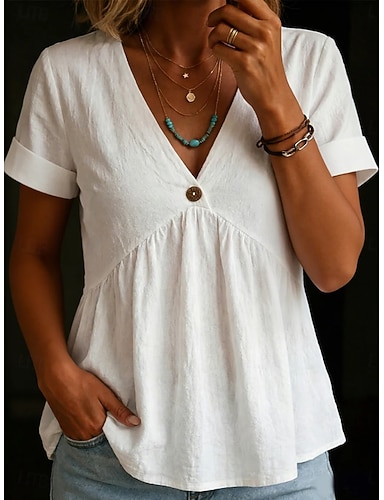 Mulheres Blusa Camisa de linho sintético Botões Côr Sólida à moda Casual Manga Curta Decote V Tops regulares Diário Azul Preto Branco Amarelo Rosa Verão Primavera