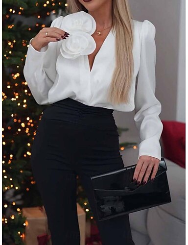 Mulheres Camisa Social Blusa Côr Sólida Negócio Moderno Casual Manga Longa Decote V Tops regulares Trabalho Traje formal Branco Vinho Marron Verão Primavera