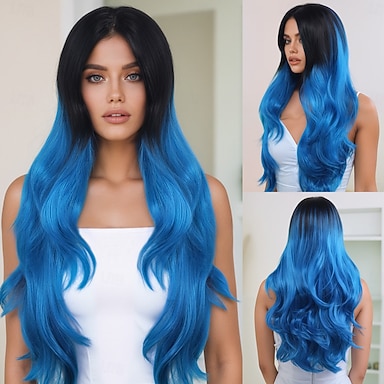 Peruca feminina longa e ondulada, preta com degradê azul, 66 cm (26 polegadas), com repartição central, feita de cabelo sintético, ideal para cosplay, festas e uso diário.