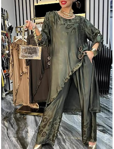 Mulheres Conjuntos de calças Bolero Top Manga Longa Decote Redondo Leopardo Franzido Elegante Moda Roupa de rua Ao ar livre Férias Feriado Verde Tropa Marron Cáqui Verão Ajuste Largo