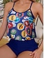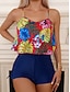 Tankini Feminino 2 Peças Maiô Shorts Controle de Barriga Cintura Alta Slim Costas Descobertas Férias Praia Floral Decote Redondo Sem Mangas