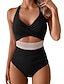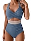 Maiô Biquíni Feminino 2 Peças Colorblock Calções Controle de Barriga Cintura Alta Slim Costas Nua Roupas de Praia para Férias Folhas Decote U Sem Mangas
