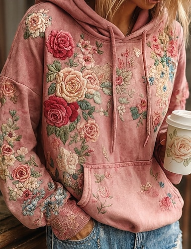 Moletom Hoodie Vintage Boho Estampado em 3D Feminino Moletom Patchwork Floral com Zíper Punk Ativo Vintage Manga Longa Com Capuz Tops Regulares Vestuário Diário Casual Patchwork Rosa Primavera Outono