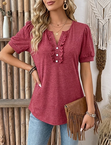 Mulheres Tops de verão Botões à moda Clássico Manga Curta Decote V Tops regulares Casual Diário Para Noite Preto Branco Rosa Vinho Azul Marinha Verão Primavera