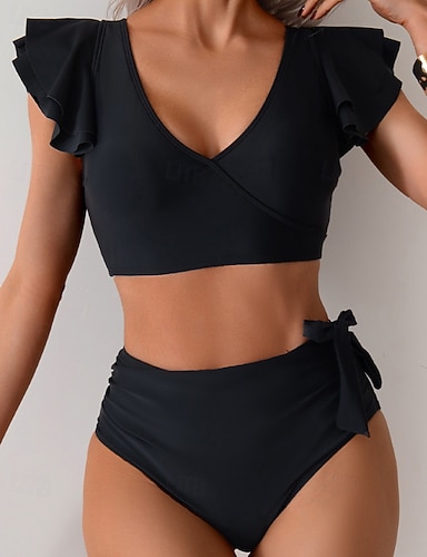 Biquíni Feminino 2 Peças Com Pregas Estilo Cheeky Controle de Barriga Cintura Alta Slim Costas Descobertas Roupas de Praia de Férias Sólido Decote em V Sem Mangas