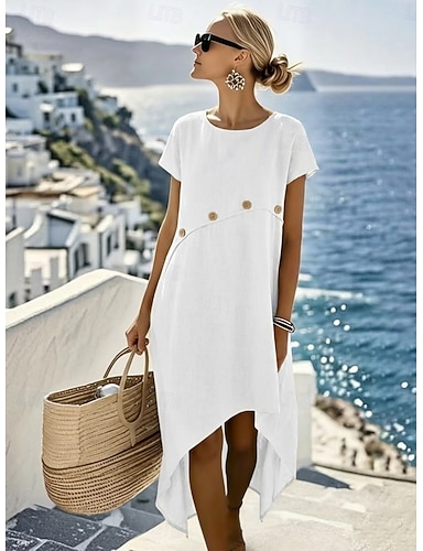 Mulheres Vestido midi Vestido casual Moda Moderno Ao ar livre Férias Para Noite Ajuste Largo Tecido Manga Curta Gola Redonda Branco Vinho Azul Real Marron Verão Primavera