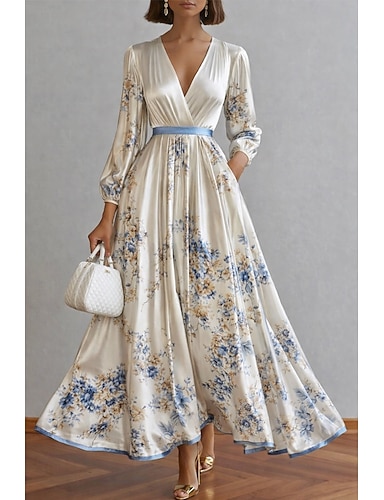 Linha A Longo Até o Tornozelo Vestidos de cocktail Elegante Floral Manga Longa Decote V Festa de Jardim Casamento Cetim Costas Degagê com Estampa floral