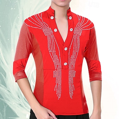 Camisa masculina vermelha com strass para dança latina, manga 3/4, em tecido mesh. Ideal para apresentações em bailes de salão.