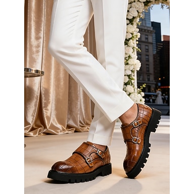Sapatos masculinos marrons de couro sintético com fivela dupla e design estampado, elegantes para casamento, perfeitos para o noivo e convidados.
