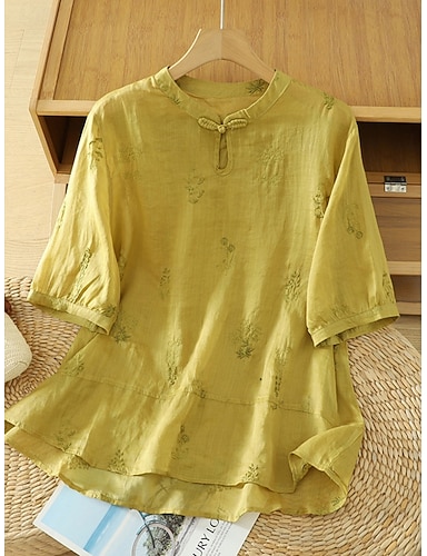 Mulheres Camisa Social Blusa Camisa de algodão Linho de algodão sintético Tecido à moda Clássico Moderno Manga Curta Colarinho Mandarim Tops regulares Diário Feriado Para Noite Amarelo Verão Primavera