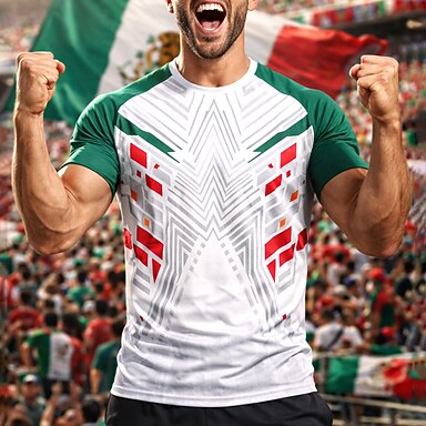 Camisa de futebol masculina, modelo México, branca com mangas verdes e estampa geométrica vermelha, em malha respirável com proteção solar UPF50+, ideal para torcedores em torneios.