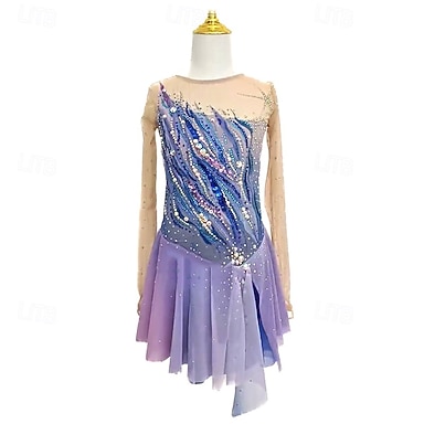 Vestidos para Patinação Artística Mulheres Para Meninas Patinação no Gelo Vestidos Roxo Patchwork Thumbhole Com Transparência Elasticidade Alta Treino Competição Roupa para Patinação Clássico Cristal