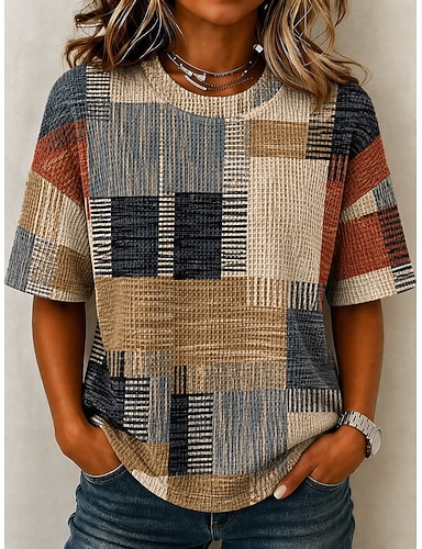 Mulheres Camiseta Waffle Tops tricotados texturizados Camiseta Tops de verão Ombro caído Imprimir Gráfico Geométrica Xadrez Vintage à moda Clássico Manga Curta Gola Redonda Decote Redondo Tops