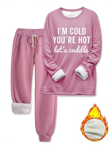 Conjunto de Pijamas Feminino Forrado de Fleece Elegante Quente Moda Conjuntos de Duas Peças Conjunto de Calças de Treino Manga Longa Gola Bishop Estampa Gráfica Letra ao Ar Livre Férias Diárias Preto