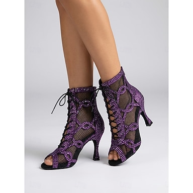 Botas de dança latina femininas com strass, sapatos de dança de salto alto com cadarço e tela para salsa, tango e dança de salão. & estágio