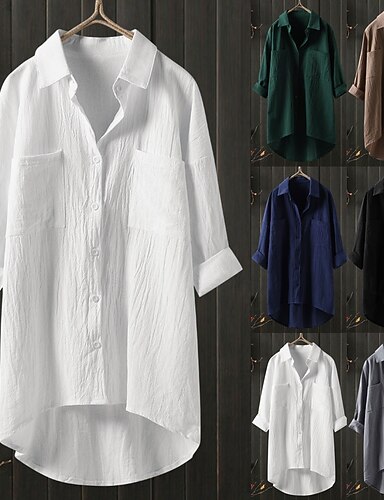Mulheres Blusa Camisa de algodão Linho de algodão sintético Botões Côr Sólida Diário à moda Básico Manga Longa Colarinho de Camisa Tops longos Diário Preto Branco Azul Marinha Verde Cáqui Primavera