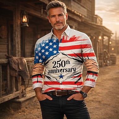 250º Aniversário EUA Retro Vintage Anos 70 Camisa Camisa Aloha Manga Comprida Hippie Geométrico Étnico Fantasia Homens Baile de Máscaras 4 de julho Festa Dia da Independência Adulto Camisa
