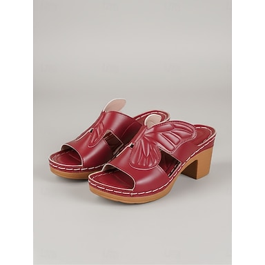 Sandálias femininas de salto bloco com estampa de borboleta em tom bordô – sandálias mule confortáveis de bico aberto, ideais para o jardim e para o dia a dia.