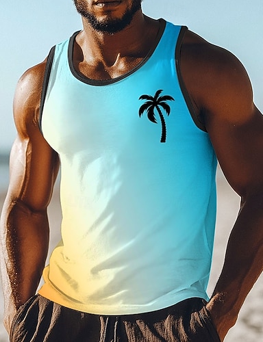 Camiseta regata masculina sem mangas com decote em U, estampa degradê minimalista em tons de ciano, azul claro e amarelo com palmeiras, ideal para férias na praia, estilo urbano, casual e esportivo,