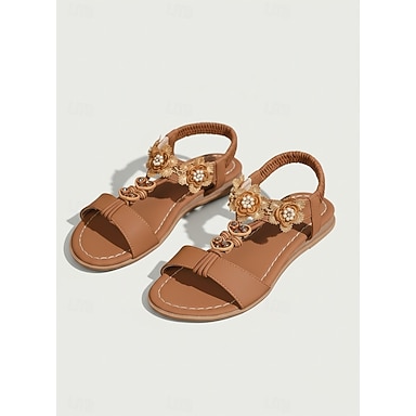 Sandálias rasteiras femininas estilo boêmio com apliques florais 3D - sandálias de verão bege com tiras e detalhes em pérola - sandálias confortáveis em estilo étnico para casamentos na praia e férias.