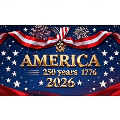 Tapeçaria comemorativa de luxo do 250º aniversário dos EUA, com letras em azul brilhante e detalhes em dourado, design da bandeira e medalha para a celebração do Dia da Independência.