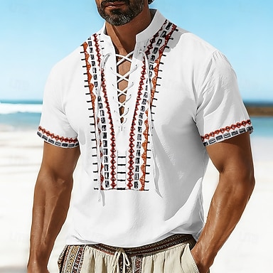 Homens Estampa Geométrica Étnico Camisa Social Camisa Pirata com Cadarço Camisas de Pulôver Manga Curta Vintage retrô Casual / Diário férias na praia Verão Primavera Colarinho Chinês Impressão 3D