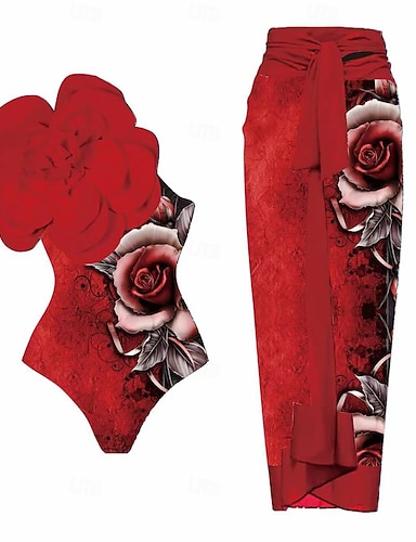 Mulheres Roupa de Banho Uma pedaço 2 partes Monoquíni Saia roupa de banho Compressão abdominal Cintura Alta Delgado Frente Única Elegante Férias Floral Rosa Pescoço Assimétrico Sem Manga Fatos de