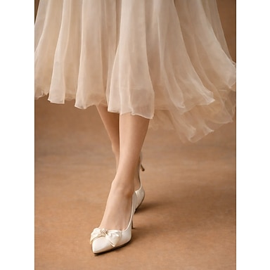 Sapatos de noiva femininos com laço de cetim e detalhes em pérola – sapatos de salto agulha de bico fino para casamentos formais na igreja e em salões de baile.