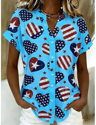 Dia da Independência Americana Mulheres Blusa Botões Imprimir Coração Gráfico Geométrica Vintage à moda Casual Manga Curta Decote V Tops regulares Diário Azul Branco Amarelo Verão Primavera