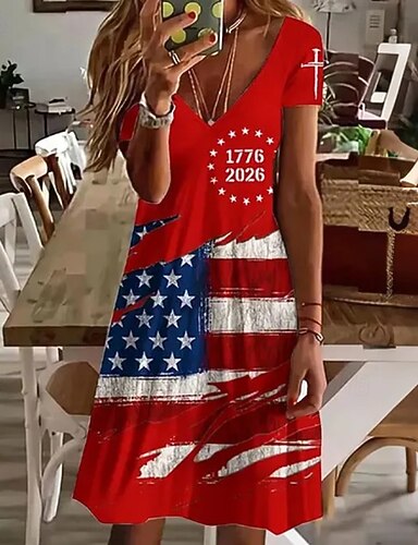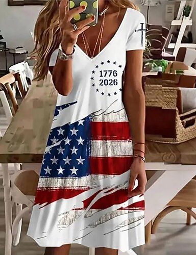 Dia da Independência Americana Mulheres Camiseta Imprimir Gráfico Bandeira americana Vintage à moda Clássico Manga Curta Decote V Tops regulares Diário Azul Branco Verão Primavera