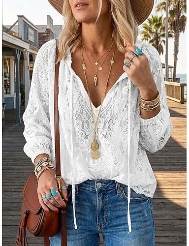 Blusa feminina boho de renda com decote em V, manga longa, estilo casual, patchwork, cor sólida, branca, ideal para primavera e verão.