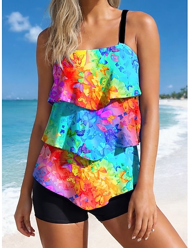 Maiô Tankini Feminino 2 Peças Cintura Alta Babado Costas Nuas Moda de Férias Praia Ombre Gráfico Decote U Sem Mangas