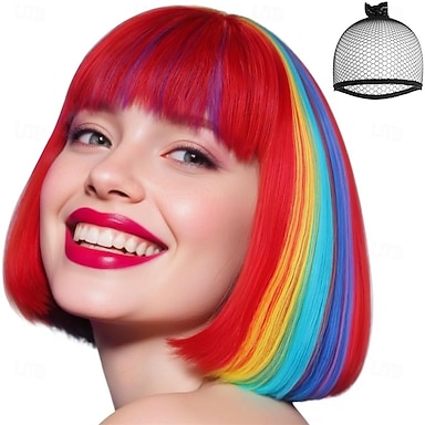 Peruca de Carnaval 2026 Vermelho Azul Laranja Liso Bob Curto Peruca sintética para festivais Mardi Gras Parada Cabelo para fantasia de cosplay para Feminino