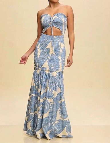 Mulheres Vestido Longo Vestido Maxi Vestido da bainha Vestido estampado Moda Moderno Festa de Noite Festa Ocasião Especial Normal Folha Manga Longa Sem Alças Azul Verde Primavera Outono Inverno
