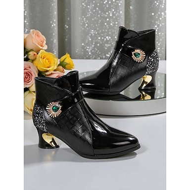 Botas de cano curto femininas em verniz preto - botinhas de salto alto com textura de crocodilo, broche de strass esmeralda e salto com glitter, perfeitas para festas noturnas ou looks de noite.