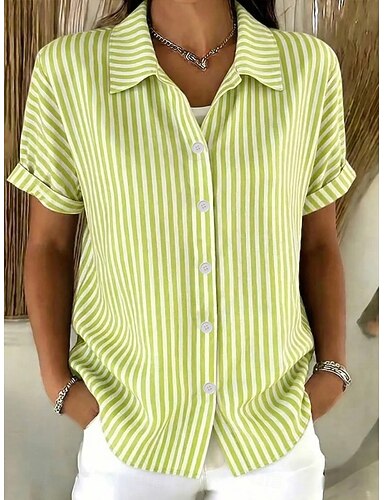 Mulheres Camisa Social Gráfico Geométrica Listrado Vintage Diário à moda Manga Curta Colarinho de Camisa Tops longos Casual Diário Azul Verde Rosa Verão Primavera